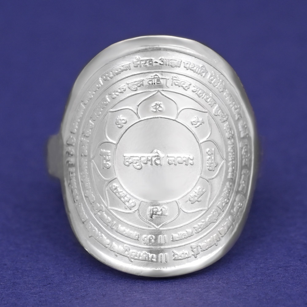 Vivid Panchmukhi Hanuman Yantra Ring in Silver meticulously crafted in sterling silver, this ring beautifully displays the revered yantra, which is a potent symbol believed to invoke the blessings of Bhagawan Hanuman. This Yantra ring has the Panchmukhi Hanuman Yantra on top and an image of the five-headed and five-armed Panchmukhi Hanuman on the inside. This yantra grants its bearer courage, fearlessness, and divine protection. It repels negativity, obstacles, and malefic influences, creating a harmonious and auspicious atmosphere. Moreover, it is renowned for augmenting both physical and mental expertise, cultivating persistent dedication, and offering guidance towards the righteous path.
