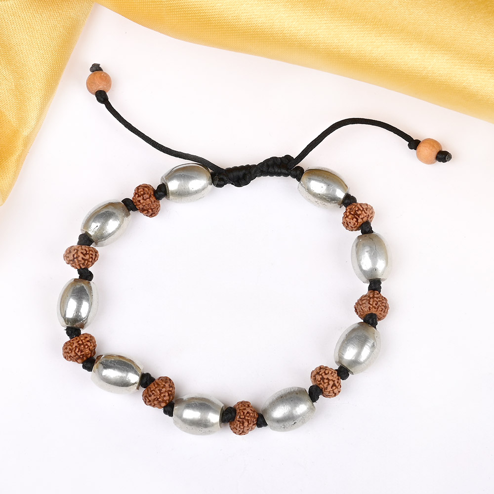 The Parad Barrel Beads x 10 Mukhi Rudraksha Bracelet is a spiritually potent and elegantly crafted accessory that harmoniously blends sacred elements with refined design. Featuring authentic 10 Mukhi Rudraksha beads paired with lustrous Parad (Mercury) barrel-shaped beads, this bracelet embodies divine protection, balance, and spiritual strength. Strung on an adjustable black thread, it ensures a comfortable and secure fit, making it suitable for daily wear.