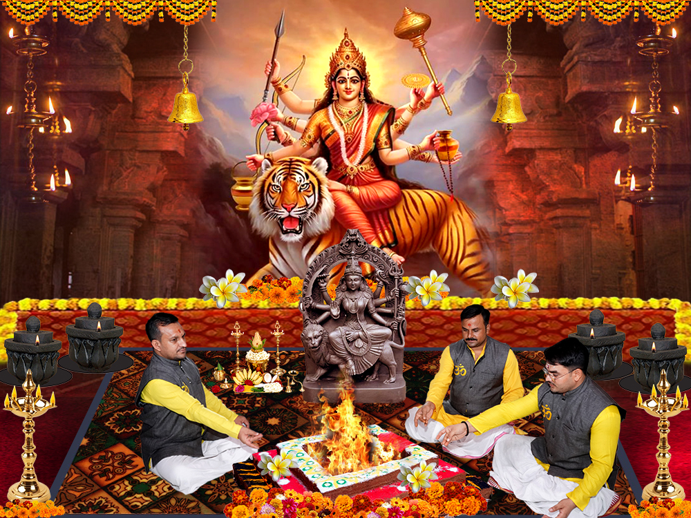 Puja Service includes: Kalash Sthapana, Gath Sthapana, Panchang Sthapana(Gauri Ganesh, Punyavachan, Shodash Matrika, Navgraha, Sarvotabhadra), Invocation of Durga, Gauri Tilak mandal, 64 yogini Puja, Sapthgrihith Matrika Pujan, Chatukashti Yogini Mangal Pujan, Shetrapal Pujan, Swasti Vachan, Sankalpa, Ganesh Pujan and Abhishek, Navgraha Pujan and 108 chants of each planetary mantra, Invocation of major Gods and Goddesses in Kalash, Installation of Mud/Clay Idols of Durga and Pujan, Recitation of Durga Sahasranamam Strotra(11 times), Durga Mantra Japa(1100 times), Homa, Aarti and Pushpaanjali.