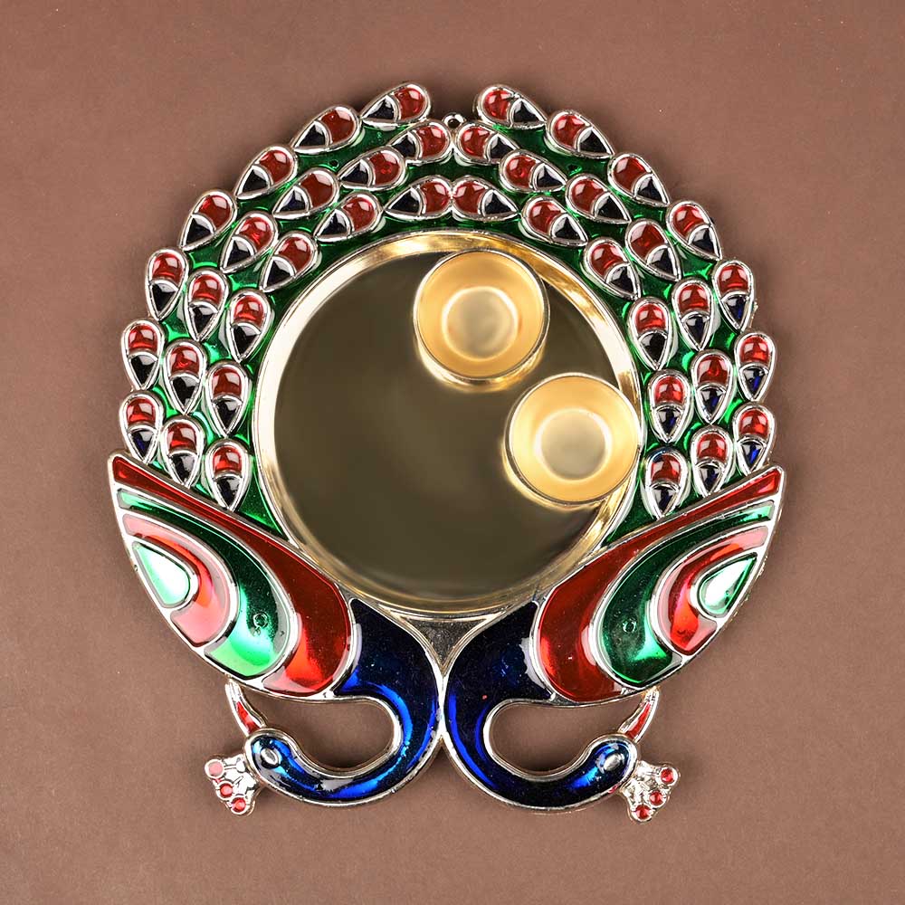 This Peacock Puja Thali is an outstanding piece. The designer has creatively hand crafted two Peacocks on the sides, with the puja thali held in between them. The Peacocks carved perfectly , each showing one profile and their feathers beautifully falling down curving in from both the sides. The Peacocks are painted in Blue, Green and Red colour scheme. The thali itself is without any design, which enhances the look of this thali. The thali has two small containers for Haldi and Kumkum.
