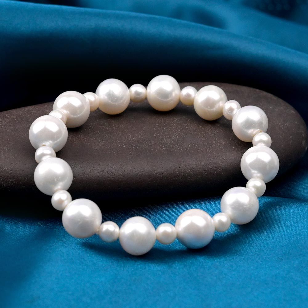 Natural cultured pearls separated by smaller sized beads are beautifully assembled on a stretchable rubber string to make a charming bracelet. With perfect soft white hue and soft sheen, the bracelet makes a charming accessory suitable for both casuals and semi-casuals. The brilliant smoothened finish of each bead and easy to roll-in feature of bracelet makes it a highly comfortable wear. Pearl brings emotional balance and enhances the memory and skin beauty of the wearer.