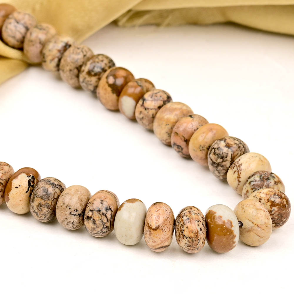 This mala is crafted from smooth, elliptical Picture Jasper beads, each showcasing earthy hues of beige, cream, caramel, and warm brown with distinctive natural veining and landscape-like patterns. The oval shape of the beads adds a refined and contemporary touch, offering a comfortable grip and a unique visual appeal compared to traditional round malas. The organic textures and natural variations make every piece truly one of a kind, while the secure silver-toned clasp enhances both durability and sophistication. The overall design beautifully balances rustic charm with understated elegance, making it suitable for spiritual practice as well as mindful everyday wear.