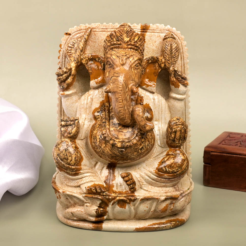 Picture Jasper is known for its grounding energy and strong connection to the Earth. It is believed to enhance spiritual insight, bring emotional stability, and inspire creativity. When carved into the form of Lord Ganesha, the stone's natural earthy patterns amplify the idol's power to remove inner and outer obstacles, deepen focus in meditation, and attract prosperity with awareness.