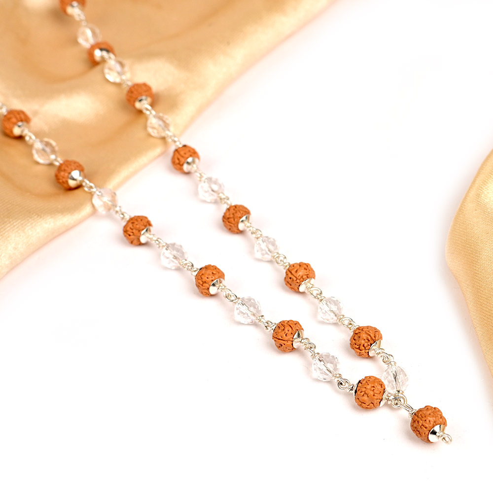 This elegant mala features Premium 5 Mukhi Rudraksha beads alternating with finely faceted Sphatik (Quartz Crystal), each capped with 925 silver plain caps and joined with silver wire.