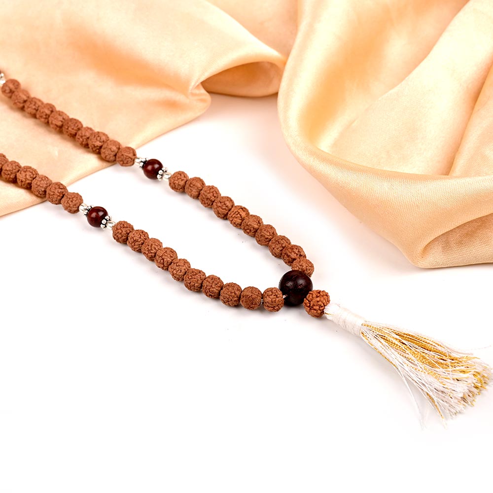 Red Sandalwood beads between the Rudrakshas lend a grounding and meditative quality, while the decorative silver caps add grace and elevate its appearance for both ritual use and daily wear.