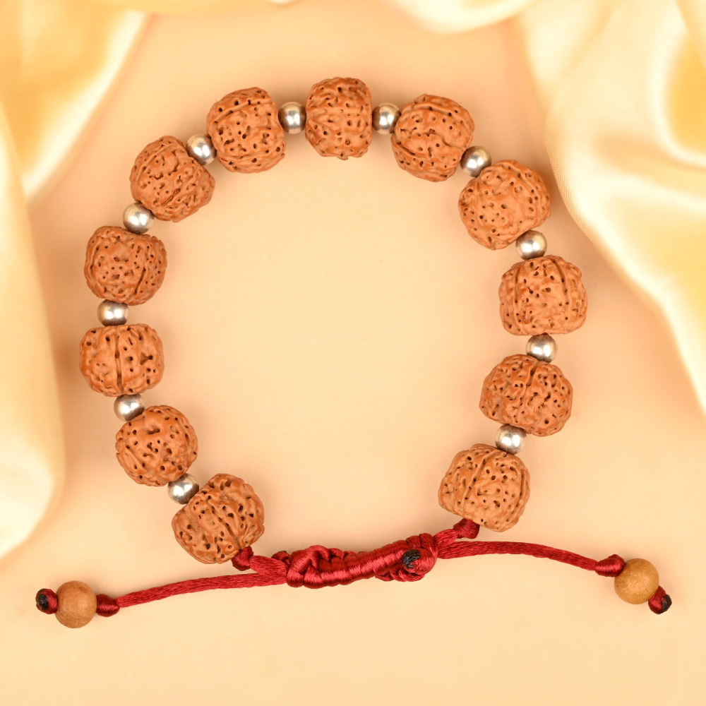 This bracelet is crafted using superior-quality Javanese 5 Mukhi Rudraksha beads paired with pure 925 Sterling Silver spacers, offering a refined spiritual accessory with a modern touch.