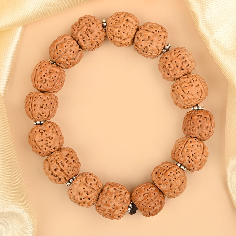 The 5 Mukhi Rudraksha is ruled by planet Jupiter, also known as Guru or Brihaspati. This powerful bead awakens the Upaguru, or higher self, bringing clarity, peace, and mental focus. It balances the throat chakra, offering relief from thyroid and hormonal imbalances. The bracelet helps increase spiritual awareness, improve immunity, and provides strength during times of emotional or physical stress. The silver chakri spacers enhance its energetic properties, making it an ideal tool for personal transformation and healing. Designed with Rudraksha Ratna Chakra Therapy (RRCT), this bracelet promotes spiritual development.