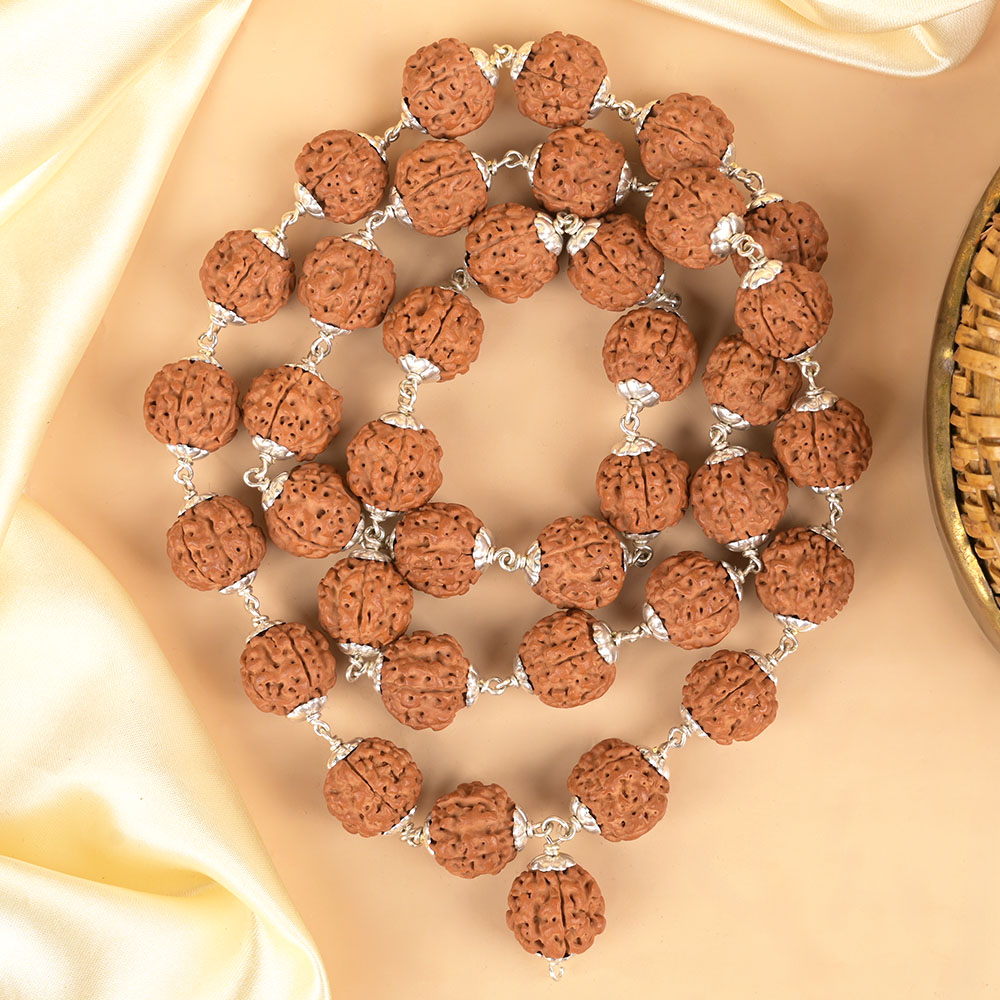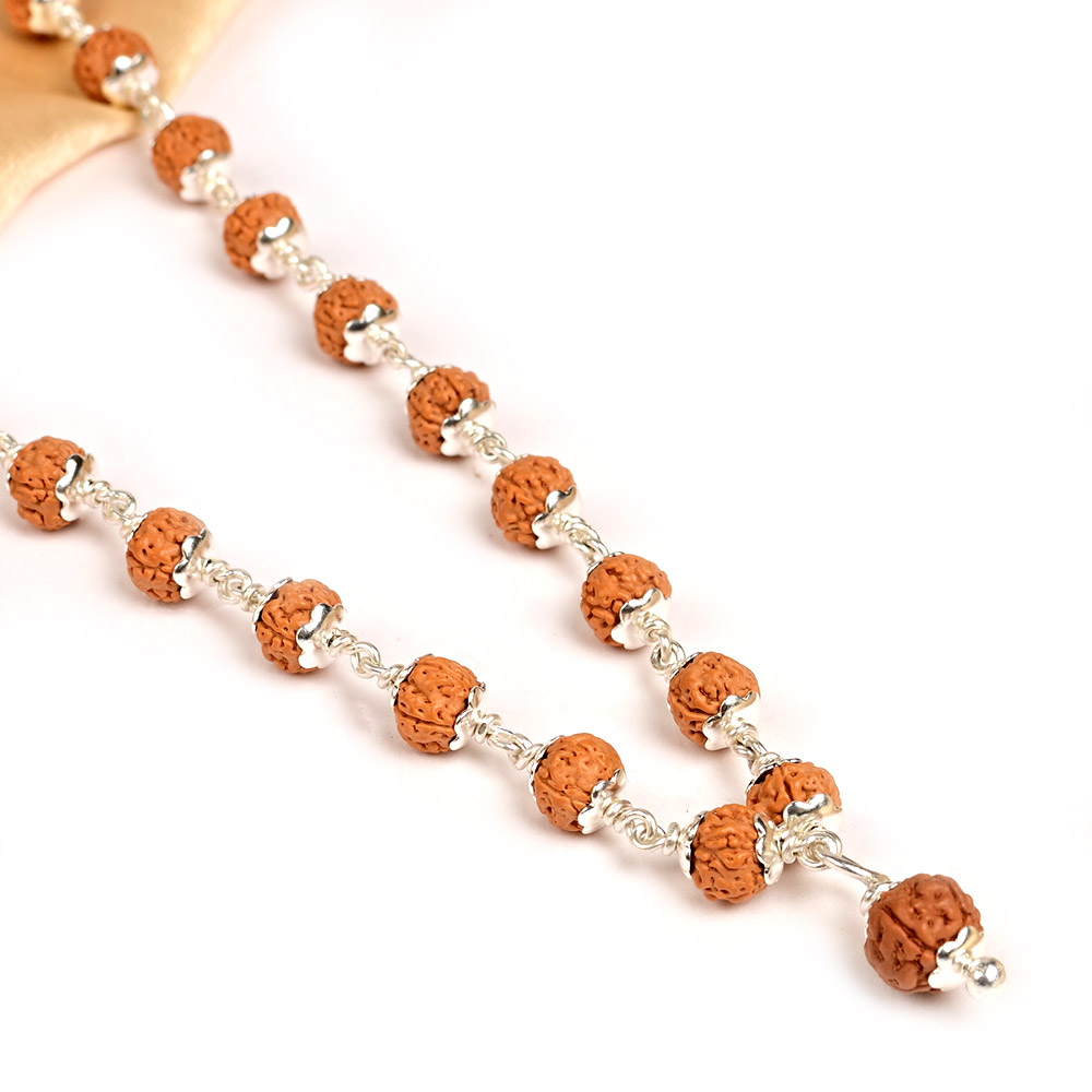 This premium mala features high-grade 5 Mukhi Rudraksha beads handpicked for their uniform size, deep natural grooves, and high surface luster. Each bead is mounted with artistically crafted 925 silver flower caps and linked with silver wire in an elegant design.
