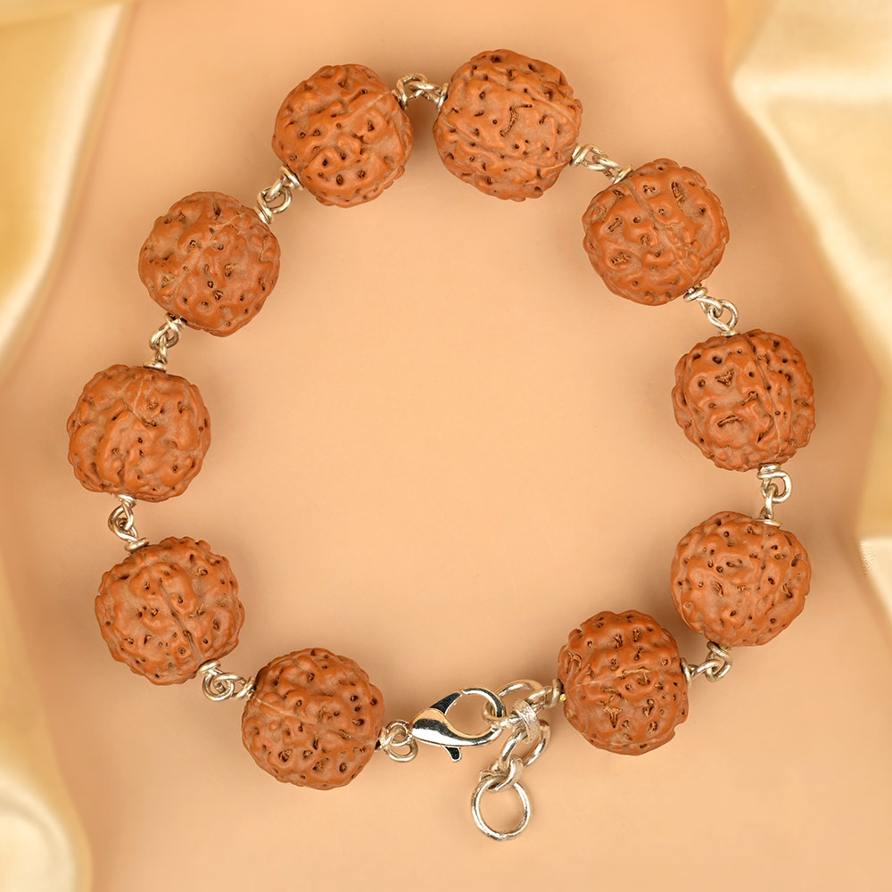 This elegantly crafted bracelet features Premium 5 Mukhi Rudraksha beads, each handpicked for its natural texture and well-defined mukhi lines. The beads are beautifully strung with a fine 925 sterling silver wire that adds both strength and subtle elegance to the design. The minimalistic silver wire complements the richness of the Rudraksha, creating a modern yet spiritually powerful accessory. The bracelet is flexible and durable, making it ideal for everyday wear or for use during meditation and spiritual practices.
