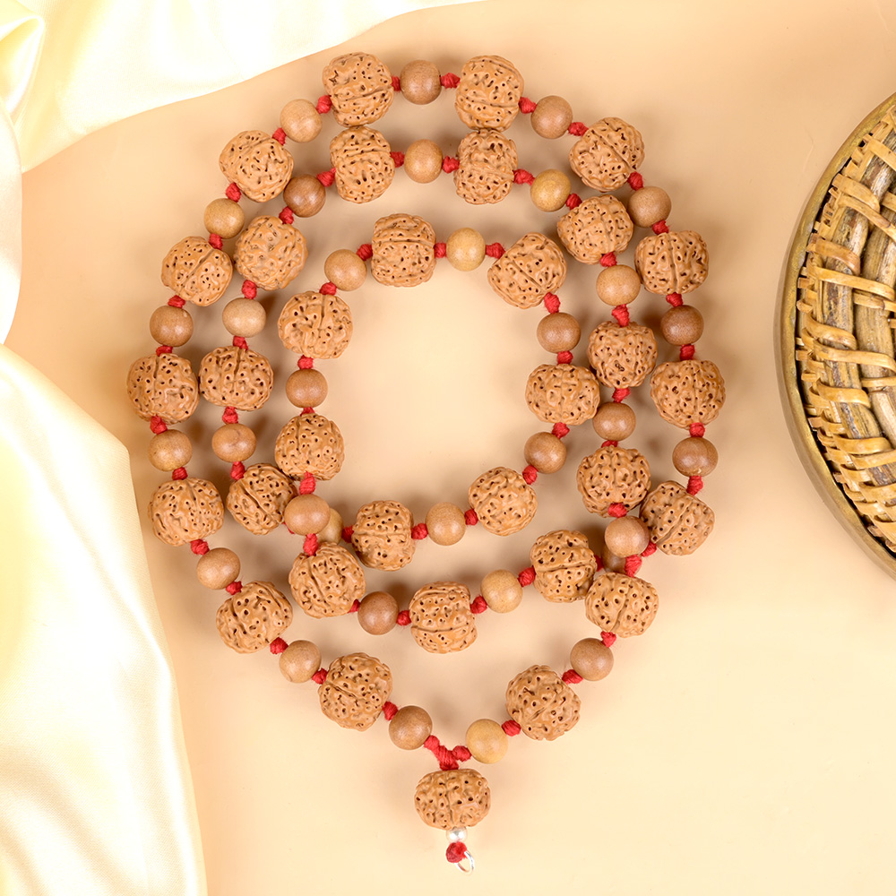 Crafted with Premium Grade Smooth Javanese 5 Mukhi Rudraksha and Natural Sandalwood Beads, this mala is available in multiple sizes to suit your preference.