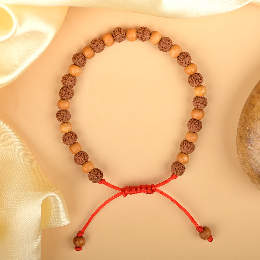This adjustable bracelet is crafted using authentic 5 Mukhi Nepali Rudraksha beads paired with smooth, natural Sandalwood beads, all strung on a sturdy red adjustable cord for a secure and comfortable fit. The textured brown Rudraksha beads beautifully contrast with the soft, golden-toned Sandalwood, creating a calm, earthy, and harmonious look. Its balanced arrangement and simple aesthetic make it ideal for everyday wear as well as spiritual practices.