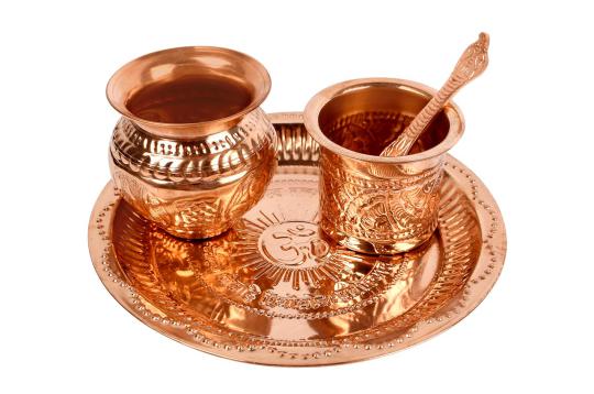 Puja tray made of copper. It holds the following items (clockwise):