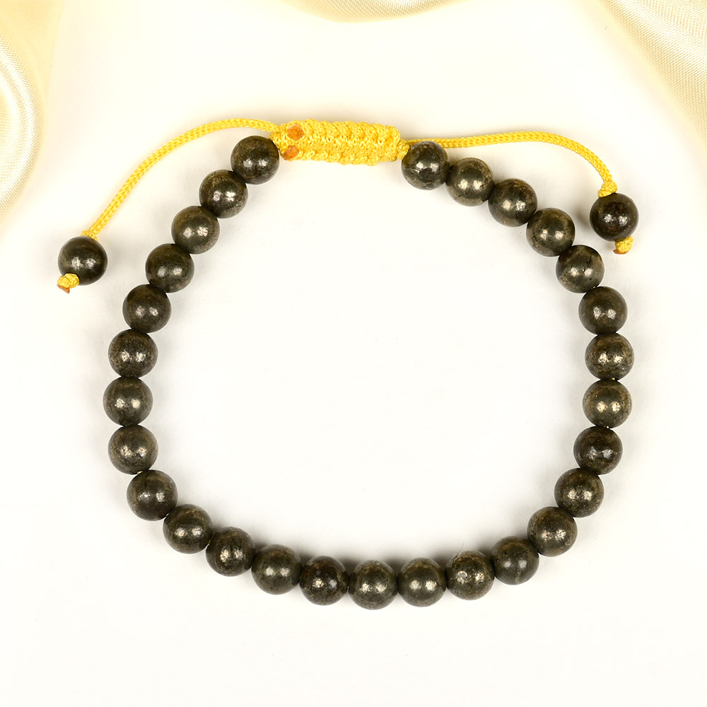 This bracelet features polished round Pyrite beads with a subtle metallic luster, strung neatly on a durable yellow adjustable cord. The golden thread adds a bright contrast to the natural dark-gold tone of the Pyrite stones, giving the bracelet a refined yet earthy look. The adjustable design ensures a comfortable fit for any wrist size, making it practical for daily wear. Its simple, minimal design blends easily with both casual and formal styles while maintaining a strong and elegant presence. Pyrite is known for its grounding and protective qualities. Physically, it is said to enhance strength, stamina, and overall energy levels. Mentally, it promotes clarity, focus, and determination, helping one stay confident and motivated. Spiritually, Pyrite acts as a shield against negative influences, attracting abundance and prosperity while balancing the solar plexus chakra to boost self-belief and willpower.