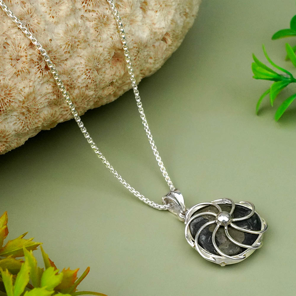 This Radha Krishna Shaligram 925 Silver Locket features a sacred Shaligram stone beautifully encased in an elegant flower-shaped silver frame, with smooth, curved petals adding a delicate charm to its divine appearance. The locket is paired with a silver chain equipped with a secure lobster clasp and adjustable hooks, ensuring a comfortable and customizable fit. Wearing a Radha Krishna Shaligram is believed to bless the wearer with divine love, harmony in relationships, and the combined grace of Lord Krishna and Goddess Radha, while also attracting spiritual growth, prosperity, and inner bliss.