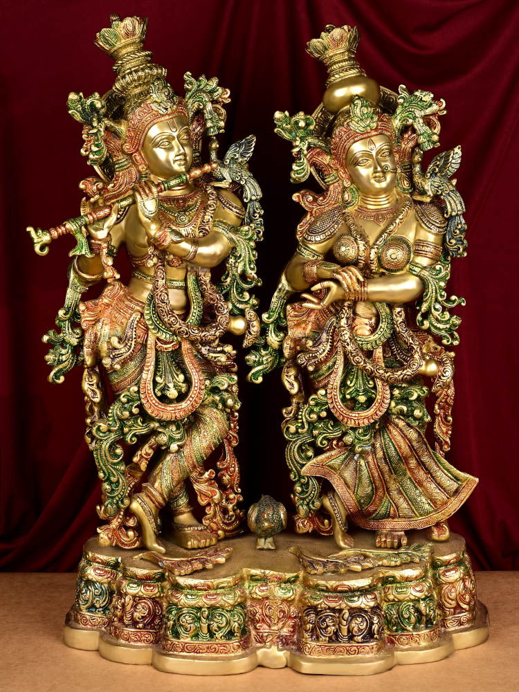 Beside Him stands Radha, His eternal consort and embodiment of pure devotion, with unmatched poise and serenity. Her right hand crosses gracefully over her left, her crown mirroring Krishna’s in regal beauty, and her jewels, anklets, and garment folds are rendered with astonishing lifelike precision. She radiates an aura of elegance and spiritual depth, completing the eternal pairing.