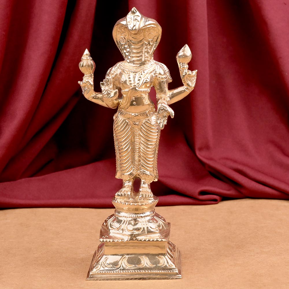 This idol made in heavy bronze features Rahu standing on a beautifully designed dais. In this idol, Rahu has a head of a snake and human body. He is decked with jewels and His right hand is raised in Abhaya mudra and left hand is seen in Varad mudra. He holds a pot is upper left palm and a snake in upper right hand. The idol due to its traditional design and rich carving looks truly charming. Rahu is shadow planet and signifies the north node of the Moon. He is one of the nine astrological planets. It presides over past life karma, speculative nature, honesty, luck, old age diseases, mishaps, religious beliefs, addiction and obstacles in accomplishment of goals. Rahu is worshipped for pacifying the malefic effects of the planet and protection from mishaps, hidden enemies and negative energies. He provides relief from addiction and bestows sudden luck and fortune. He also brings clarity to know and understand one's own mind. You may place the idol in your puja altar or living area or study or office desk.