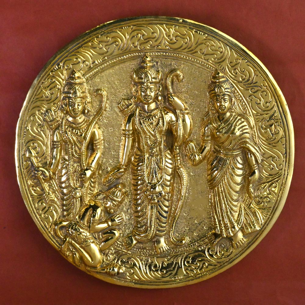 This wall artifact of Ram Darbar has Lord Ram, His consort Sita, and His brother Laxman standing and Lord Hanuman is at the feet of Ram, praying. This idol made in shining brass depicts Ram and Sita blessing their devotees. This artifact maybe hung in altar or in living room.