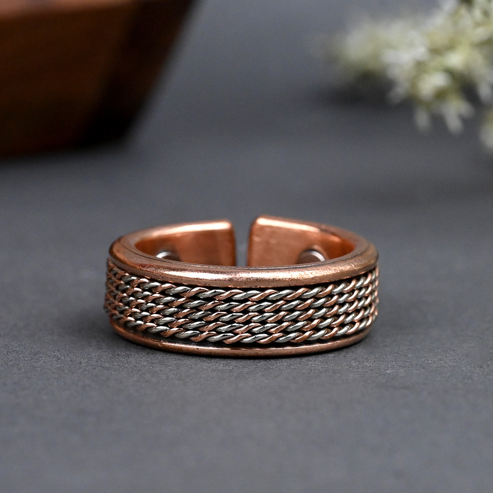 Pure copper ring fashioned in beautiful design features copper and silver wires intricately arranged in twisted pattern. Crafted to a standard of perfection, the broad ring ensures a carefree wear with adjustable feature. The ring offers a comfortable wear due to its smooth edges. Wearing the copper ring would serve as a mineral supplement with copper allowing the body to absorb mineral content of copper with ease. It helps improve immunity, regulate blood circulation, prevent bacterial attack. It is also helpful in averting the malefic effects of planet Mars and Sun and balance the Root Chakra.