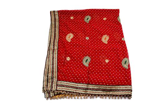 Chunri is an integral part of festivities. It is draped on head and shoulders like a scarf by women during religious functions, ceremonies and prayer rituals. It is draped around Deity Idols and altars and thus made from auspicious colors. Often a Chunri is used in altar as a seat for Idols and yantras and for adding color and festivity to the prayer room.