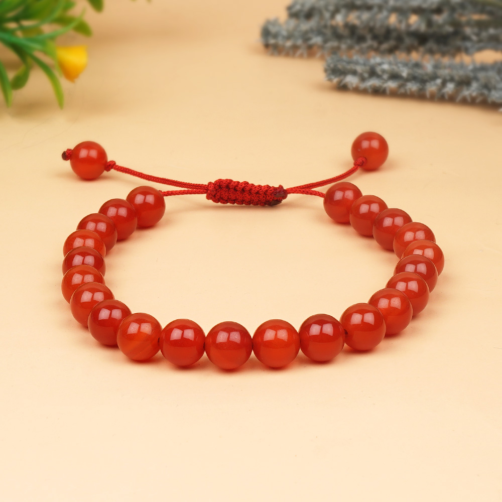 This bracelet is crafted with round, polished Carnelian beads strung on a durable red thread with a braided adjustable closure for a comfortable and flexible fit. The uniform shine and vibrant reddish-orange tone make it ideal for everyday spiritual wear. Spiritually linked to the Sacral Chakra and governed by the energy of moon, Carnelian helps energize the body and mind while bringing emotional and mental balance. Benefits: Enhances courage and motivation, stimulates creativity, stabilizes emotions, and protects against negative energy.