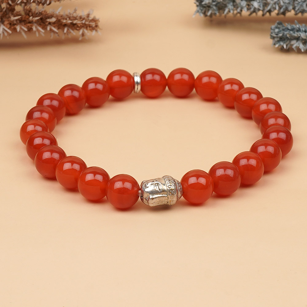 This bracelet features smooth, round Carnelian beads strung on an elastic thread, centred with a silver-toned Buddha charm. A single metallic spacer adds balance to the warm, glowing red-orange tones of the beads, making it a striking piece for spiritual wear. The Buddha charm symbolizes inner peace, awareness, and awakening. Spiritually linked to the Sacral Chakra and governed by the energy of moon, Carnelian helps energize the body and mind while bringing emotional and mental balance. Benefits: Enhances courage and motivation, stimulates creativity, stabilizes emotions, and protects against negative energy.