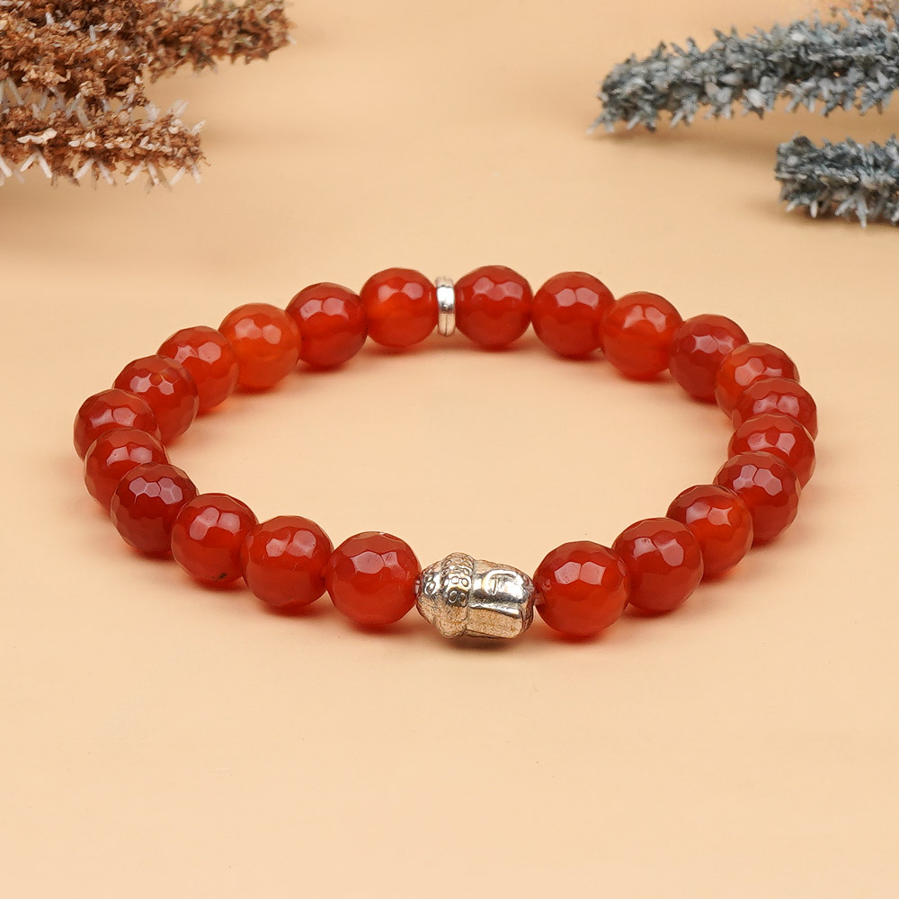 This bracelet features faceted Red Carnelian round beads that shimmer with a fiery glow, paired with a finely crafted silver-toned Buddha charm at the centre. A single metallic spacer adds balance and elegance to the design, strung on a stretchable thread for comfortable wear. The Buddha charm symbolizes mindfulness, spiritual clarity, and peace, while Red Carnelian, governed by Mars and resonating with the Root Chakra, empowers action, resilience, and emotional grounding. Benefits: Enhances spiritual focus and calm, ignites motivation and courage, stabilizes emotions, and protects against fear and negativity.