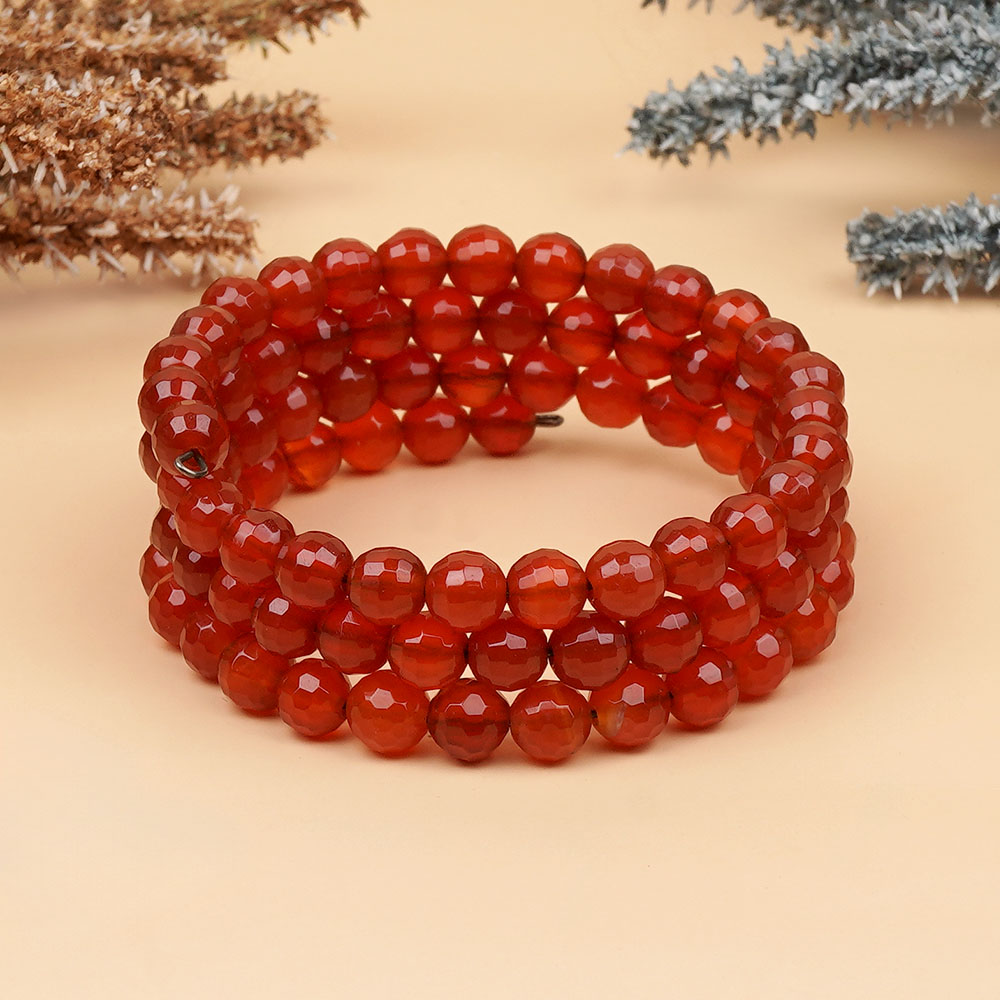 This statement bracelet features multiple rows of faceted Red Carnelian beads arranged in a coiled spiral design that wraps snugly around the wrist. The vivid reddish-orange beads reflect light with a subtle sparkle, adding both glamour and grounded energy to your look. Spiritually, Carnelian is associated with the Root Chakra and is linked to the energy of Mars in Vedic astrology. It stimulates vitality, courage, and creative drive, making it a powerful ally for those seeking motivation and grounded action. Benefits: Boosts confidence and willpower, awakens creativity, grounds scattered energy, and protects against fear and lethargy.