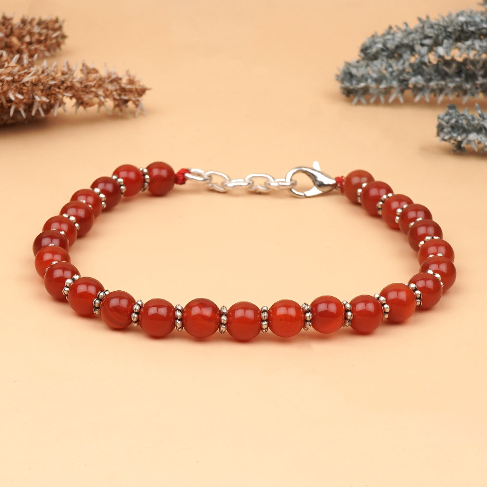 This elegant bracelet features polished round Red Carnelian beads in a rich red hue, accented with detailed German silver chakri spacers that add depth and definition to the design. Strung on a durable thread and finished with a lobster clasp and extension chain, it ensures a secure and adjustable fit for everyday wear. Made from natural Carnelian and German silver, this bracelet combines traditional energy with ornamental charm. Benefits Energizes the body, boosts confidence, and strengthens motivation. Promotes clarity, emotional resilience, and dynamic action.
