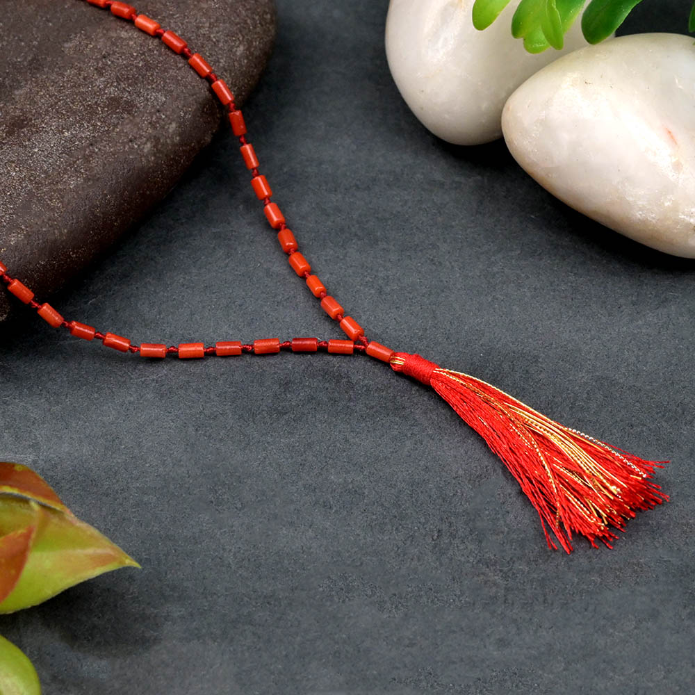 Red Coral Cylindrical Beads Mala is made of high-quality undyed Italian red coral. This mala is intricately shaped cylindrically that gives it a stylish and elegant look that also is a bold fashion statement. The knot with red silk tassel gives it a more voguish look. The best part of this stylish looking mala is that it has its tremendous health and spiritual benefits. Red coral is associated with the Mangal i.e. planet Mars, it amplifies courage, strength, and confidence, while balancing malefic effects in your astrological chart.