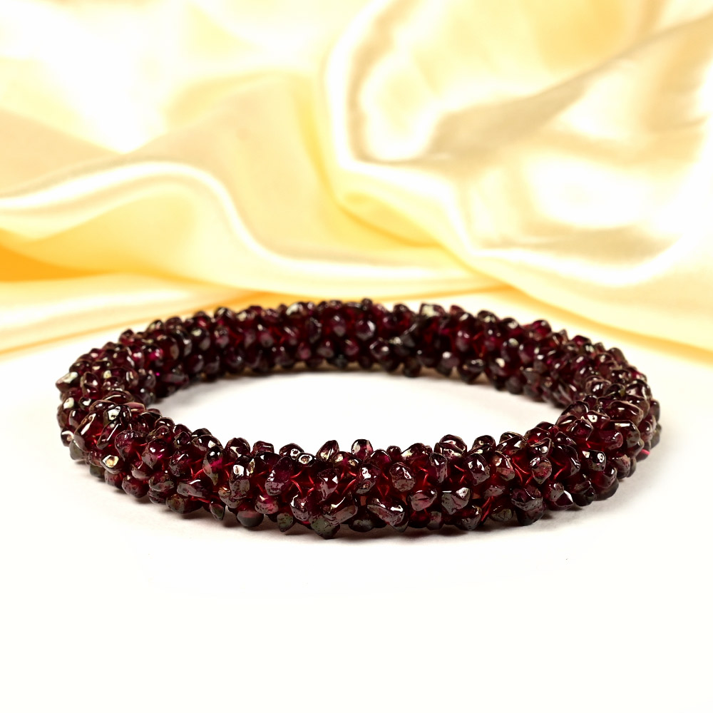 This striking red garnet uncut beads elastic bangle showcases raw, natural garnet stones that radiate strength and elegance. The uncut finish preserves the gem’s natural energy, while the elastic design ensures a comfortable fit for any wrist. It revitalizes energy, boosts confidence, enhances passion, supports emotional balance, and attracts success, blending raw beauty with powerful healing energy.