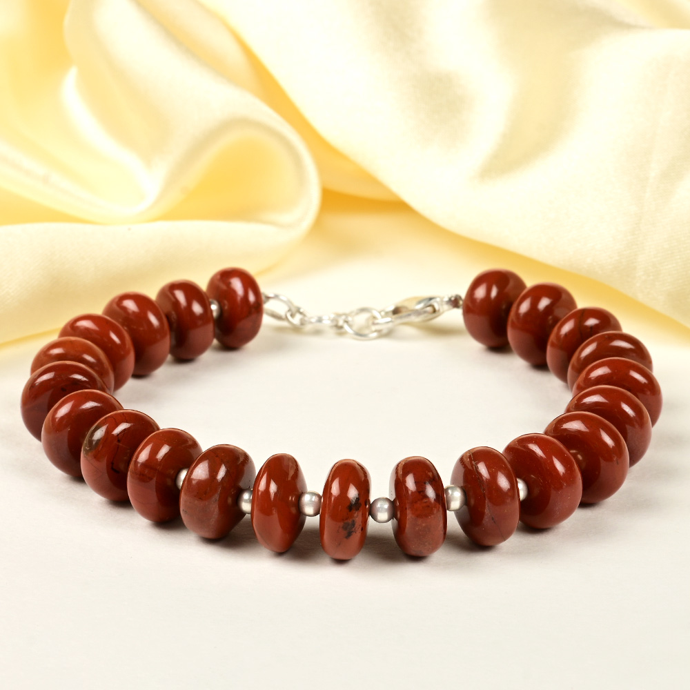 This stylish bracelet features elliptical Red Jasper beads in thread with silver polished balls and secured with a clasp. The blend of earthy red tones and silver accents creates a perfect balance of trend and tradition.