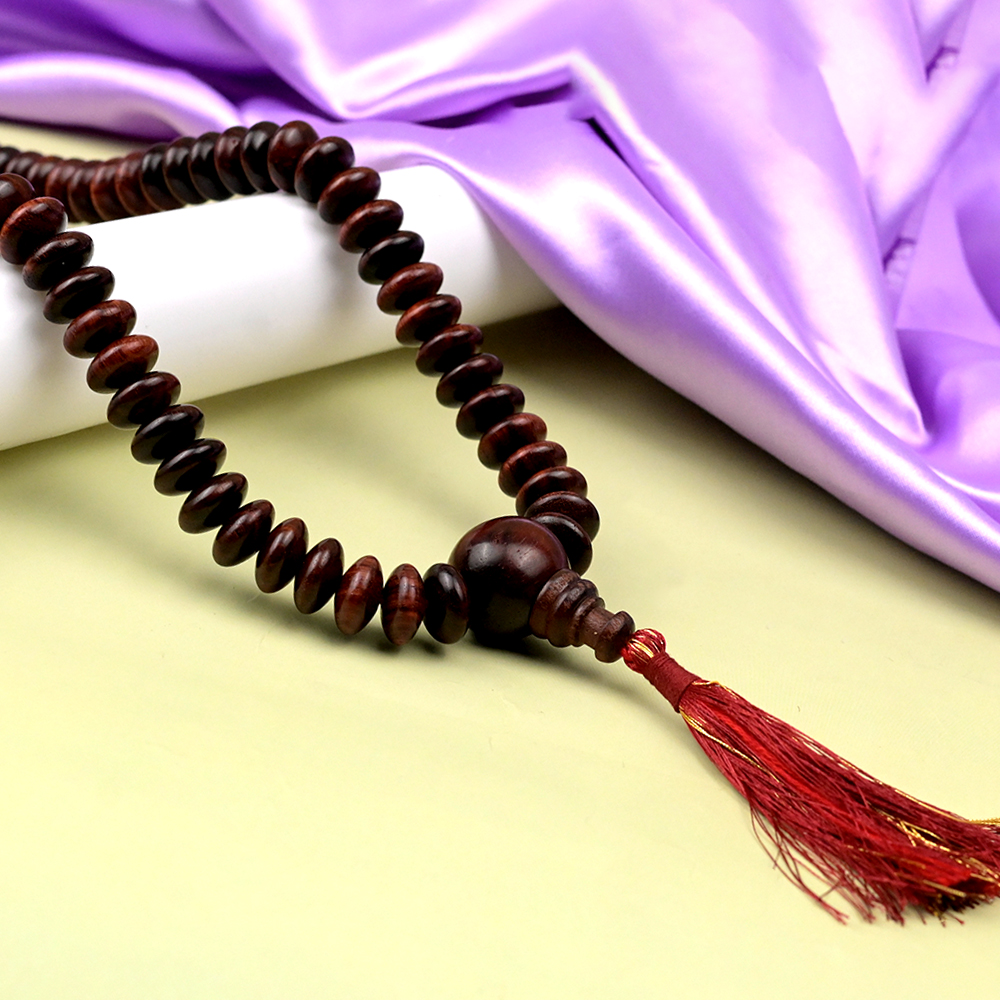 This beautiful mala is made of high quality large red sandalwood elliptical beads. Red sandalwood helps remove dullness and brings positivity, serenity, cheerfulness and helps strengthen the benefice effects of Sun on one’s wellbeing. This mala has a pleasant aroma which is not as fragrant as white sandal wood and is known to calm the senses of the wearer.