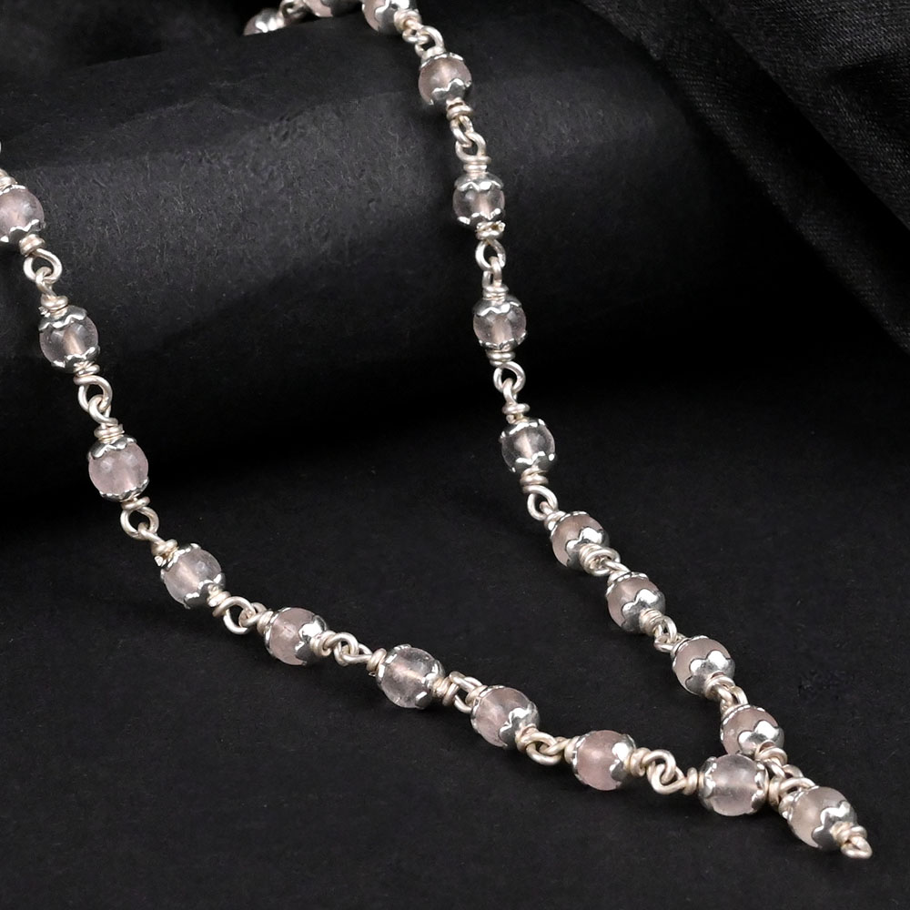 The Rose Quartz 925 Silver Caps Mala features finely polished rose quartz beads, each capped with intricately designed 925 sterling silver caps that add a refined and stylish look. Rose quartz, known as the stone of love, carries gentle and soothing energy that promotes emotional healing and harmony. This mala is perfect for meditation, spiritual practices, or as an elegant accessory.
