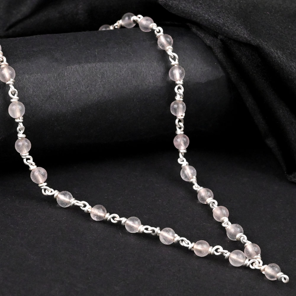 This Rose Quartz Mala is crafted with precision, featuring small faceted beads that beautifully catch the light, highlighting the soft pink glow of rose quartz, the "stone of unconditional love." Each bead is carefully knotted in durable 925 silver wire, offering elegance to the design.