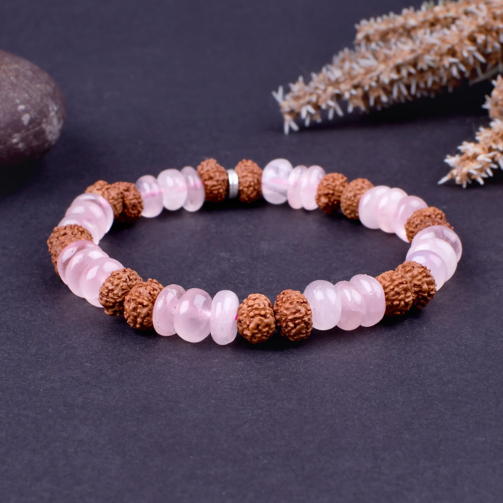 This bracelet features elliptical-shaped Rose Quartz beads alternating with 7 Mukhi Rudraksha from Java, offering a unique and soothing design on a stretchable band that ensures comfort and ease of use. Blending the heart-healing energy of Rose Quartz with the prosperity-inviting power of 7 Mukhi Rudraksha, this bracelet opens your heart to receive abundance, emotional balance, and divine grace from Goddess Lakshmi.