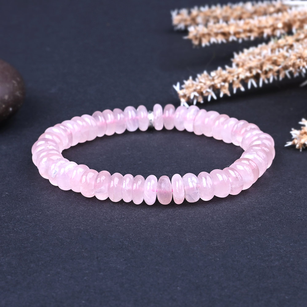 This graceful bracelet is crafted using polished elliptical Rose Quartz beads, strung seamlessly to form a stretchable design that fits snugly on the wrist. The soft pink tones radiate gentle energy, making it both a fashionable and spiritually soothing accessory. Benefits Promotes emotional healing, unconditional love, and inner harmony. Activates the Hrit Padma Chakra and nurtures feelings of self-worth and compassion.