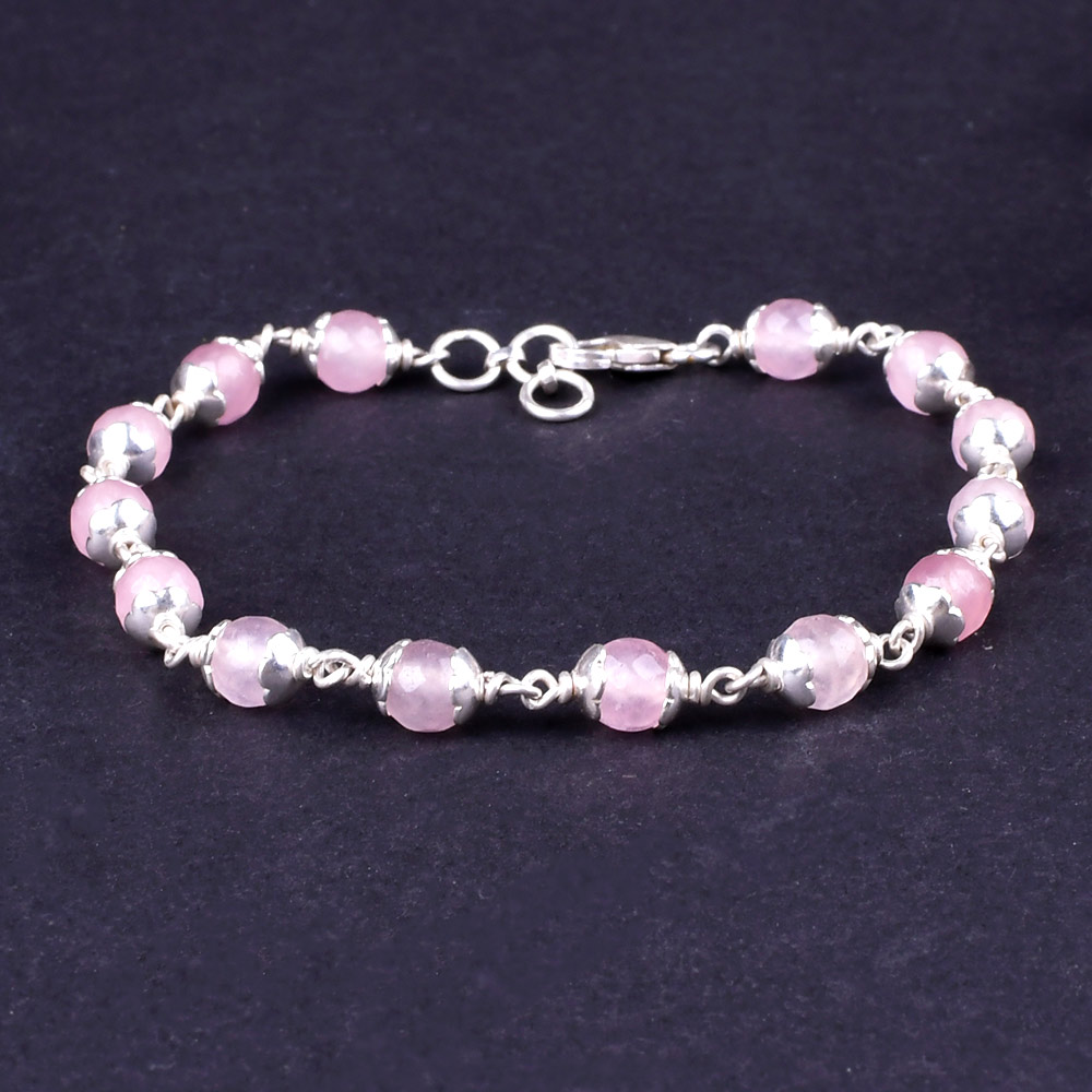 This handcrafted bracelet features faceted Rose Quartz beads nestled between intricately designed 925 silver flower caps, all linked with precision and secured with a lobster clasp and adjustable chain. Combining the softness of love with the elegance of silver craftsmanship, this bracelet nurtures emotional healing and gently inspires trust, tenderness, and self-love.