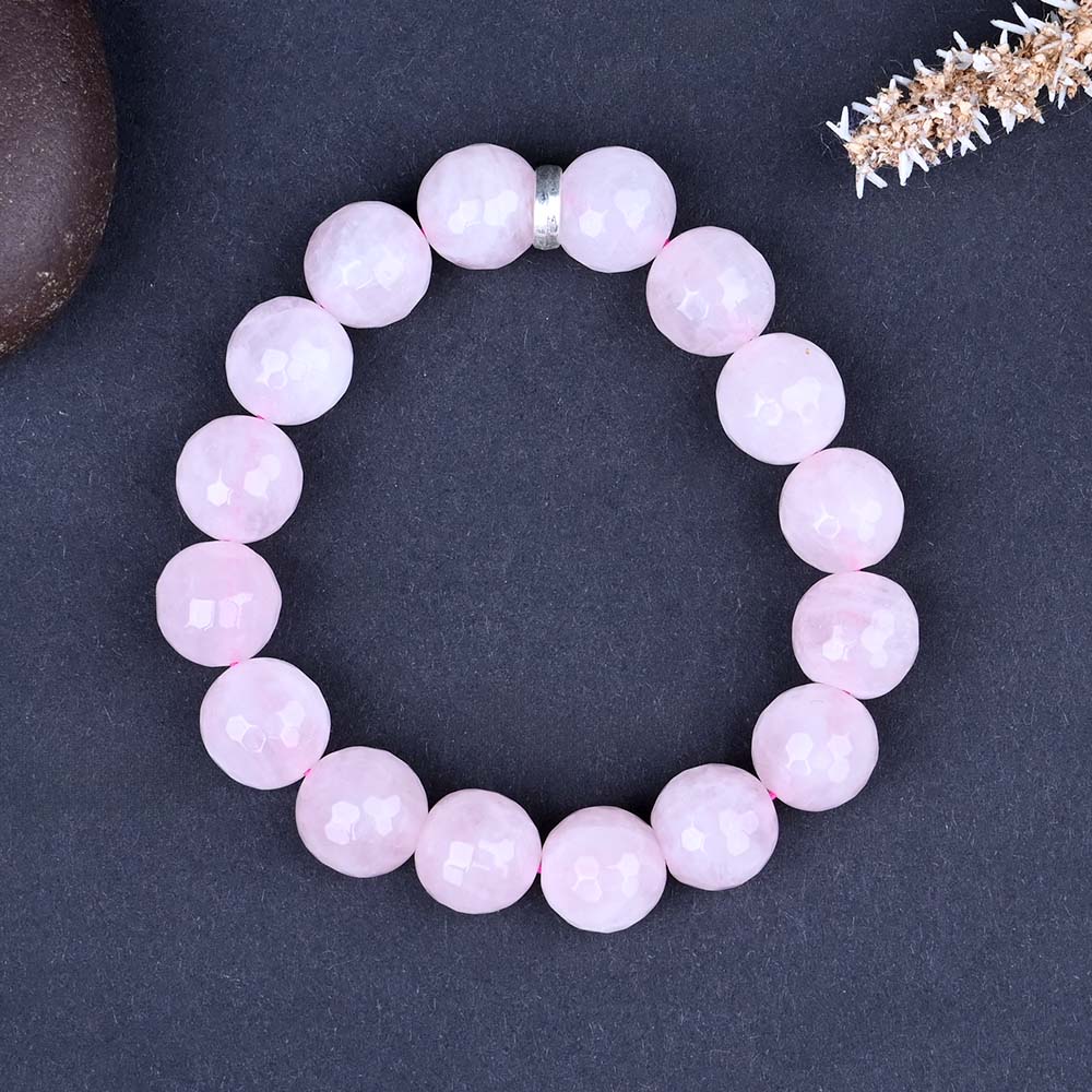 This bracelet features soft pink faceted Rose Quartz beads, known for their gentle luster and emotional resonance. Each bead is cut to subtly sparkle, making it a graceful yet powerful piece to wear every day.