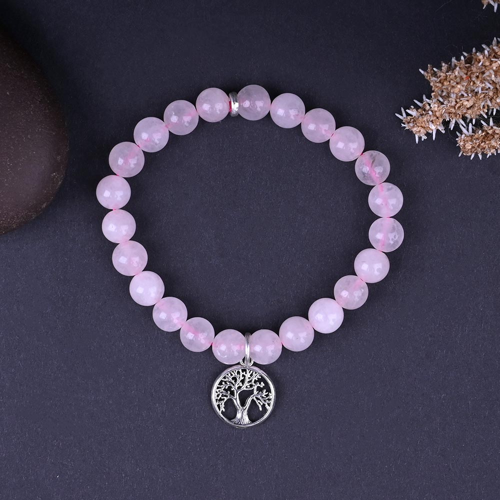 This elegant bracelet features soft pink Rose Quartz beads, strung on a stretchable band and adorned with a silver-toned Tree of Life charm that symbolizes balance, grounding, and spiritual growth. The nurturing essence of Rose Quartz opens the heart to unconditional love, while the Tree of Life serves as a reminder of your connection to the divine source and the beauty of renewal through every phase of life.