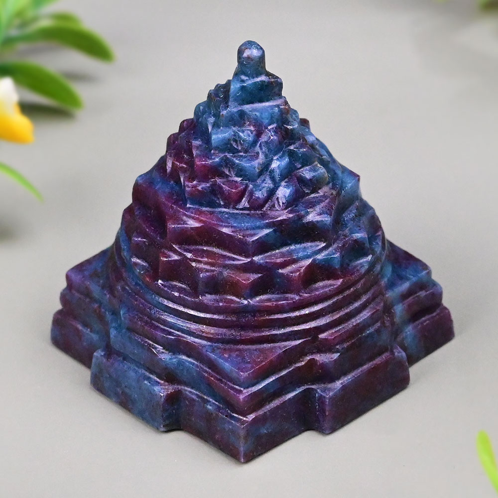 This divine Shree Yantra is made of Ruby Gemstone, crafted with precision as per the specifications in ancient texts. The term "Shree" means wealth and "Yantra" means instrument. The Shree Yantra is a mystical geometry which acts like a cosmic tool to manifest desires, material abundance, spiritual advancement, success in all aspects of life, name, fame, opulence, happiness and totality. The Shree Yantra is the most powerful of all Yantras. Keeping the Shree Yantra at home or office removes Vastu Dosha, invites auspiciousness, and keeps the space positively charged. You can meditate on the Bindu of the Shree Yantra for aligning with the energies of the Shree Yantra. The Ruby is a precious gemstone which is associated with the Sun and empowers with good health, energy, vitality, hope, wisdom, sharp intellect, name, fame, brilliance and much more. The Shree Yantra geometry amplifies the qualities of the Ruby stone which is favourable for the inmates of the dwelling. This three dimensional Shree Yantra or Meru Yantra features sacred geometry of steps in form of Bhupura leading to concurring chakra (circles), and 16 and 8 petal lotuses ascending to multiple triangular steps finally leading to focal point for convergence of soul with divine Goddess Lalita. It symbolises a total of 2816 energies or Goddesses and worshipping this Yantra means worshipping all these energies. It is the source of attaining all worldly desires & fulfilling all wishes through cosmic power.