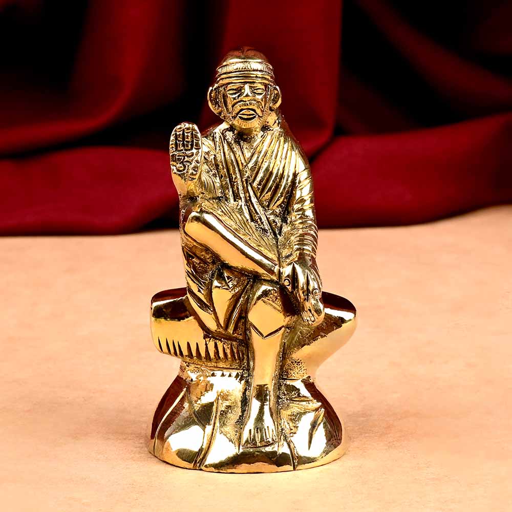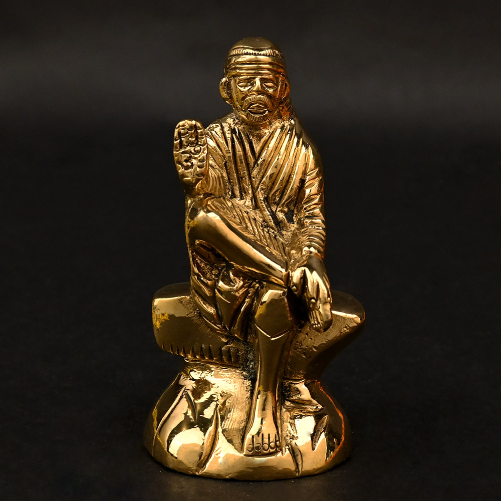 A compact brass Sai Baba murti in the classic seated pose on a rock like dais with right hand raised in blessing and left hand resting near the feet, conveying refuge, reassurance, and steady grace for daily life. Suitable for puja rooms, living areas, or office desks, it invites quiet remembrance, anchors peace of mind, and offers a protective presence amid stress and uncertainty.