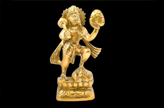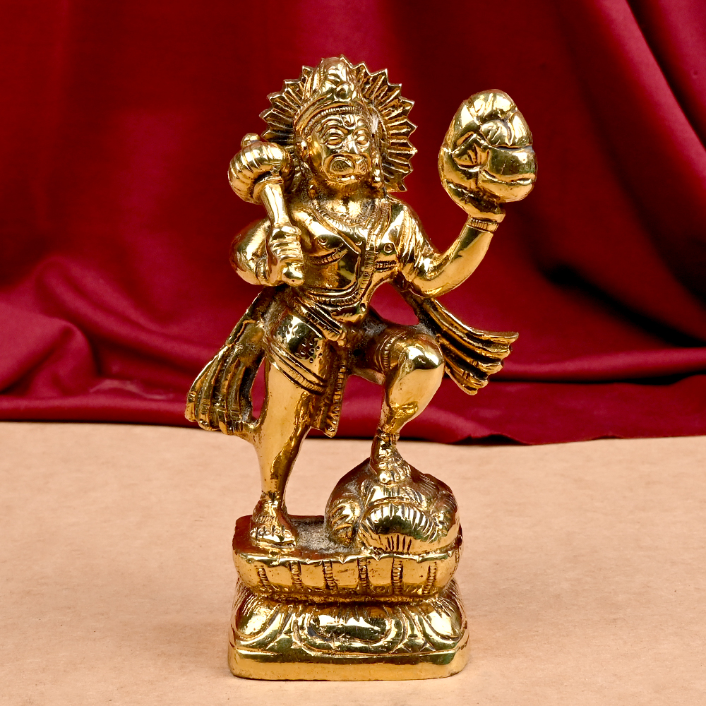 Majestic Bhagwan Hanuman idol crafted in polished brass, depicting Sankatmochan standing on an elegant pedestal while holding the Dronagiri mountain with the Sanjeevani herb and a gada, symbolizing courage, strength, and divine protection. Suitable for home altars or as a sacred gift, the form evokes Hanuman’s fearless resolve and benevolent guardianship, inviting blessings of safety and steadfast devotion.