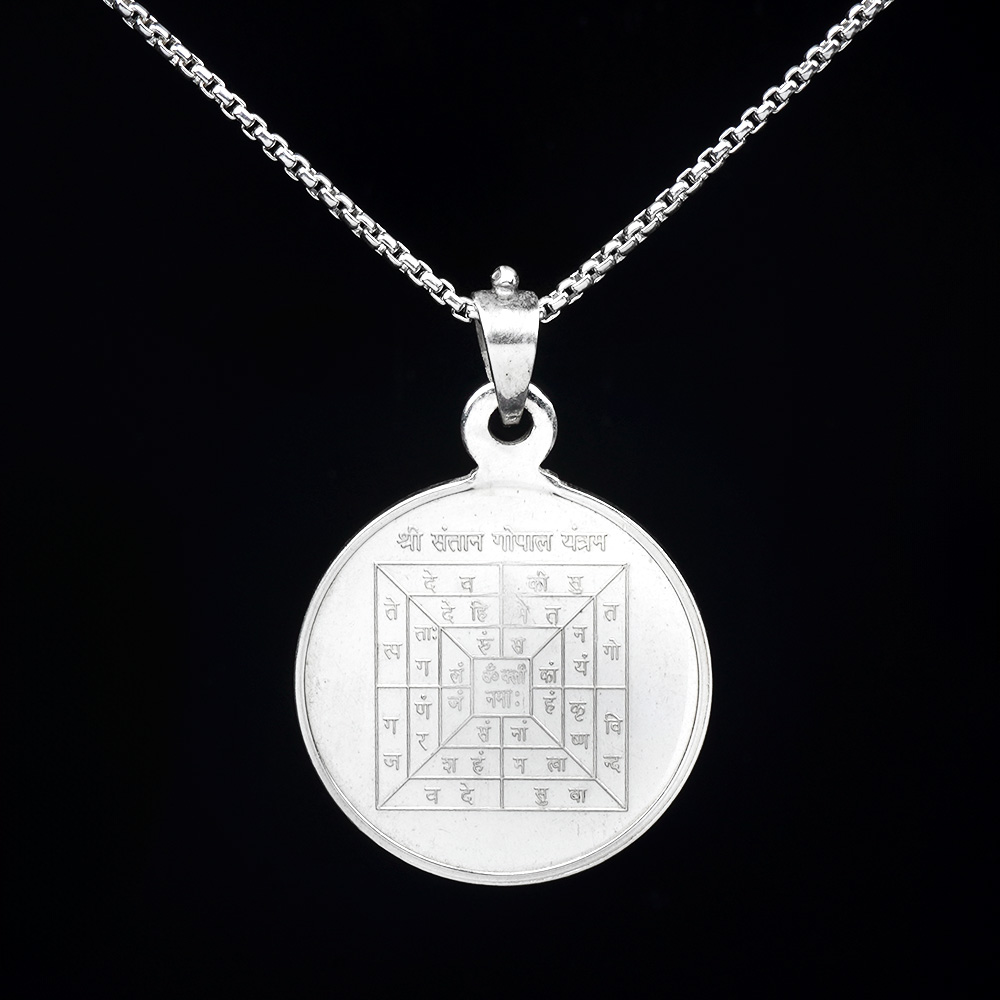 This magnificent looking pure silver locket with impeccably embossed Santan Gopal Yantra on front side and image of Bal Gopal on back side. Santan Gopal Yantra represents the infant form or Lord Krishna, Who survived through many adversaries and spread happiness through His Leelas, similarly the Yantra bestows joy and liveliness in form of progeny and spiritual progress.
