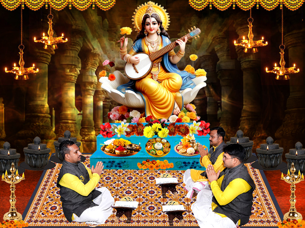 Sthapana (Ganesh, Devi, Navgraha, Kalash, Brahma), Navagraha Mantra Japa (1 mala of each planet), Rudra Kalash Pujan, Shodus Kalash Pujan, Sarvato Bhadra Pujan, Chetrapal Mandal Pujan, Chatukasti Yogini Pujan, Ganesh Laxmi Pujan & Abhishek, Invocation of all Gods and Goddesses, Saraswati Idol Pujan & Abhishek, Saraswati Yantra Abhishek and Pujan, Saraswati Strotra, Saraswati Kavach, Saraswati Chalisa recitation, Saraswati Mantra japa, Homa and Aarti