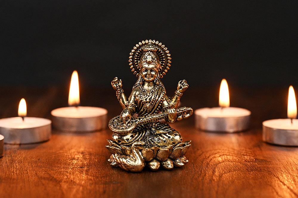 Maa Saraswati is the Goddess of education, knowledge, learning, music, fine arts, creativity, wisdom, and spiritual understanding. She is also known as 'Vaak' Devi, the Goddess of speech, and can be invoked by those who have hesitancy in verbal communication or those who want to enhance their power of speech. According to ancient texts, Goddess Saraswati gave the sacred Vedas to Her consort, Lord Brahma. Worshipping Goddess Saraswati blesses devotees with all Her qualities. Students, scholars, teachers, musicians, singers, those in the field of creative arts, and those who want to improve their memory power, stand to gain by worshipping Maa Saraswati.