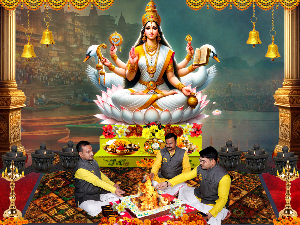 The Saraswati Puja at the Prayagraj is a divine ritual dedicated to Goddess Saraswati, the deity of knowledge, wisdom, and the arts. The puja seeks the blessings of Maa Saraswati for intellectual growth, creative abilities, and spiritual enlightenment. Perform this sacred ceremony on the hallowed grounds of Triveni Sangam, where the invisible Saraswati River meets the holy rivers Ganga and Yamuna, infusing the atmosphere with unmatched spiritual energy. The convergence of these rivers makes Prayagraj an extraordinarily powerful location for performing this puja.
