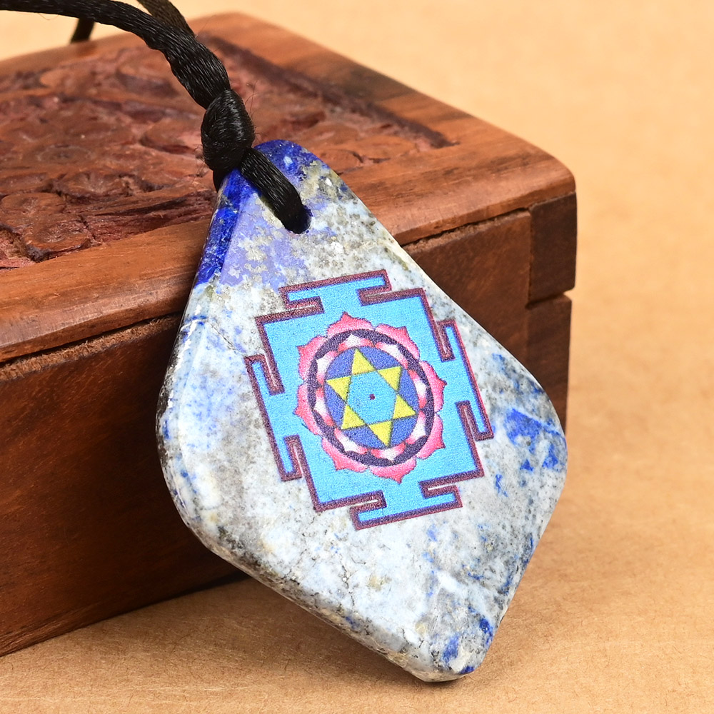 Vibrant pendant with Sacred Saraswati Yantra printed on natural Lapis Lazuli gemstone. The coloured Yantra image made of UV print is washable and long-lasting. Lapis Lazuli gemstone has properties of providing clarity, understanding, harmony and awareness. The combination of Saraswati Yantra and Lapis Lazuli provides knowledge, creativity, understanding and intelligence.