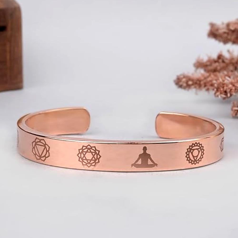 This captivating wrist accessory showcases meticulously crafted chakra symbols, symbolizing the essential energy centers within the body. Copper, renowned for its exceptional conductivity, is believed to enhance the flow of energy within the body, fostering balance and vigor. The chakra symbols are crafted to harmonize and stabilize the corresponding chakras, cultivating a feeling of peace, clarity, and a positive outlook.