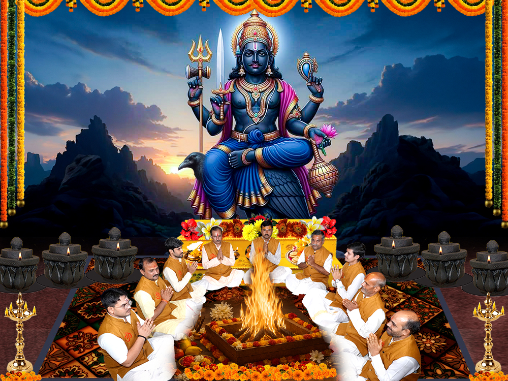 Shani Shanti Maha Anusthaan – 9 Kunda Homa is a highly powerful Vedic ritual performed to reduce the malefic effects of Shani (Saturn), remove suffering, karmic burdens, delays, and hardships, and bring stability, justice, and long-term success in life. The primary Deity worshipped in this Anusthaan is Lord Shani Dev, the divine dispenser of karma and justice.