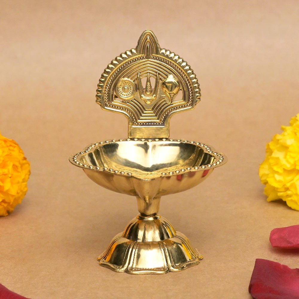 This Shanku Chakra Namam Standing Brass Diya features a gracefully crafted brass lamp with a broad, petal-shaped bowl designed to hold a single wick. The back panel showcases the divine symbols of Shanku (conch), Chakra (discus), and Namam (sacred mark), representing Lord Vishnu and his divine presence. Supported by a sturdy, embossed pedestal base, this diya combines traditional design with deep spiritual meaning. Lighting this diya during prayers is believed to invoke Lord Vishnu’s blessings, purify the atmosphere, and attract divine protection, peace, and prosperity into the home.
